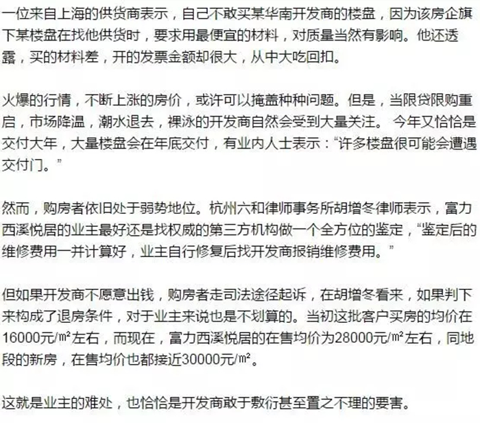 10月,媒體以《富力的功力(利):二十多天“打造”的精裝房,敢收嗎》和《交付1年多還沒收房,這些業主遭遇了什么》為題,報道了富力西溪悅居溪區以及北區兩大樓盤的嚴重質量問題。溪區在今年9月30日交付,而北區的交付時間則是2015年9月30日,且都是精裝修樓盤。