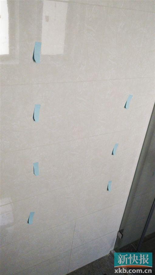 21日上午,記者在賀帆家中看到,其家中還大大小小貼著不少便利貼,標記了所在位置存在的滲水、空鼓等裝修問題,在衛生間和廚房等位置,記者用手敲擊了貼有標記的瓷磚,其發出“嘭嘭”的悶響,顯示出其后部水泥不足。